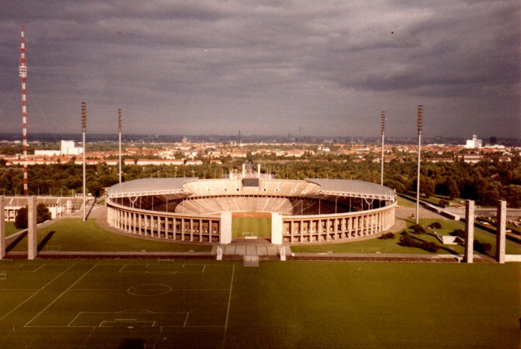 In the afternoon we travelled to the west of the city. First stop was the Schloss Charlottenburg, the seventeenth-century Prussian palace. After looking round inside and visiting the gardens, we moved on to the Olympic Stadium, site of the notorious 1936 Olympic Games. When we got there, the gates to the stadium were open to allow spectators to exit from a football match which was nearing its end, so we were able to enter for free. This was before the Stadium’s refurbishment in 2004 so that it could be used as a venue for the 2006 World Cup, so the majority of the seating was just spartan wooden benches. At the time, as it still is, the stadium was home to Hertha Berlin, who were then in the second division of the Bundesliga. I had always assumed that I had seen the final 10 minutes of a Hertha Berlin Bundesliga game that day, but on researching this post discovered they were not playing at home that weekend, so it was probably a reserve team game that we witnessed. After the game had finished, we went to the top of the adjacent Bell Tower, which gave good views of the stadium and of the city beyond.