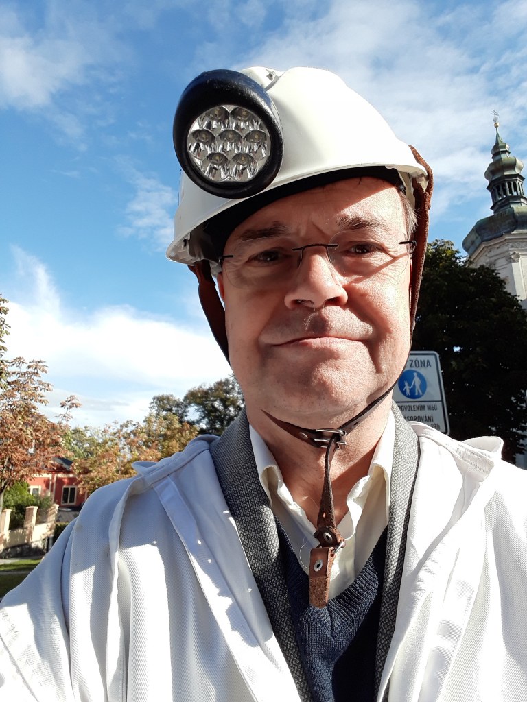 When I left the cathedral it had stopped raining and the sun was coming out. I made my way to the Museum of Silver, where I had made an on-line booking a few days earlier for a tour of a silver mine. The booking system was unusual – if nobody else had yet booked a particular time slot you could choose the language for the tour (at the time I booked it gave a choice of Czech, English or French). But by having booked an early afternoon tour in English, it then blocked out English as choice for the language for the tour before and after it. When I got there, I checked in and deposited my bag, as due to the narrow passages, no bags are allowed in the mine. I had a little time before the tour was due to begin, so I made a start of looking round the museum describing the history of silver mining in the area. When the due time came, there was a small group of about eight people waiting to go down the mine. We were first taken to a small cave entrance with a few steps, to test how we would cope with with the claustrophobia and climbs of the real mine. Having convinced our guide that we would cope we were taken to be kitted out in overalls, helmets and lamps, before going on a short walk to the mine entrance. We descended stairs which had been installed in a deep shaft to the dimly lit mine, which was damp and very narrow in places. Normally you would follow a linear route which would bring you to an exit back at the museum, but at the time of my visit this was being renovated so we had to return the way we came in. When we were in the furthest part of the mine the guide turned off all the lights, so we could get a sense of the darkness in which the miners would have operated.