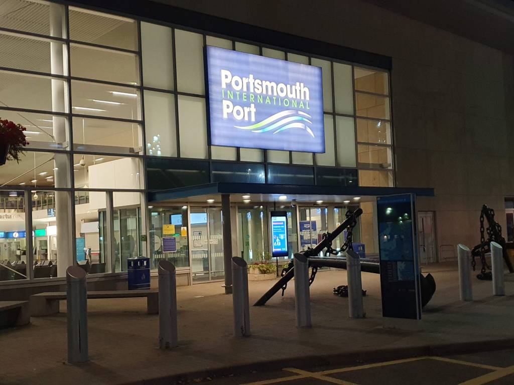 Brittany Ferries had informed me that I needed to check in at least 90 minutes before my 11pm departure, so I left the restaurant to walk to the ferry terminal to be there in good time. Most of the walk was along the main road out of Portsmouth skirting the Royal Navy base. I arrived at the ferry terminal at about 9pm, two hours before departure. Check-in was quick and easy, and I was informed that boarding was expected at 10:15pm. There were not very many foot passengers waiting in the cavernous terminal building and I subsequently discovered that the majority of these were waiting for the Caen ferry, whose boarding commenced at 9:45pm.