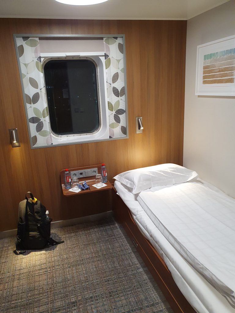At exactly 10:15pm, as promised, boarding commenced. Apart from me, there were just seven other foot passengers. After passing the the security scanners we all boarded a bus which drove us onto the car deck of the Galica where we were met and taken by lift to the main body of the ship. I quickly found my cabin for the night – I had splashed out and paid for an en-suite cabin, though given it would be dark for the entire duration of the crossing, paying extra for an outside window was probably a bit extravagant. My cabin on the Galicia was the nicest room I stayed in on the whole trip. The Galicia was an enormous and very modern ship, which had only just entered service. There appeared to be very few passengers on board – it felt rather strange to have such a large boat almost to oneself. In October 2021 there was just the one sailing per week, by any vessel, from Portsmouth to Cherbourg – the Galicia returns to Portsmouth overnight on Monday night and for the remainder of the week she (as her name suggests) travels to and from northern Spain.