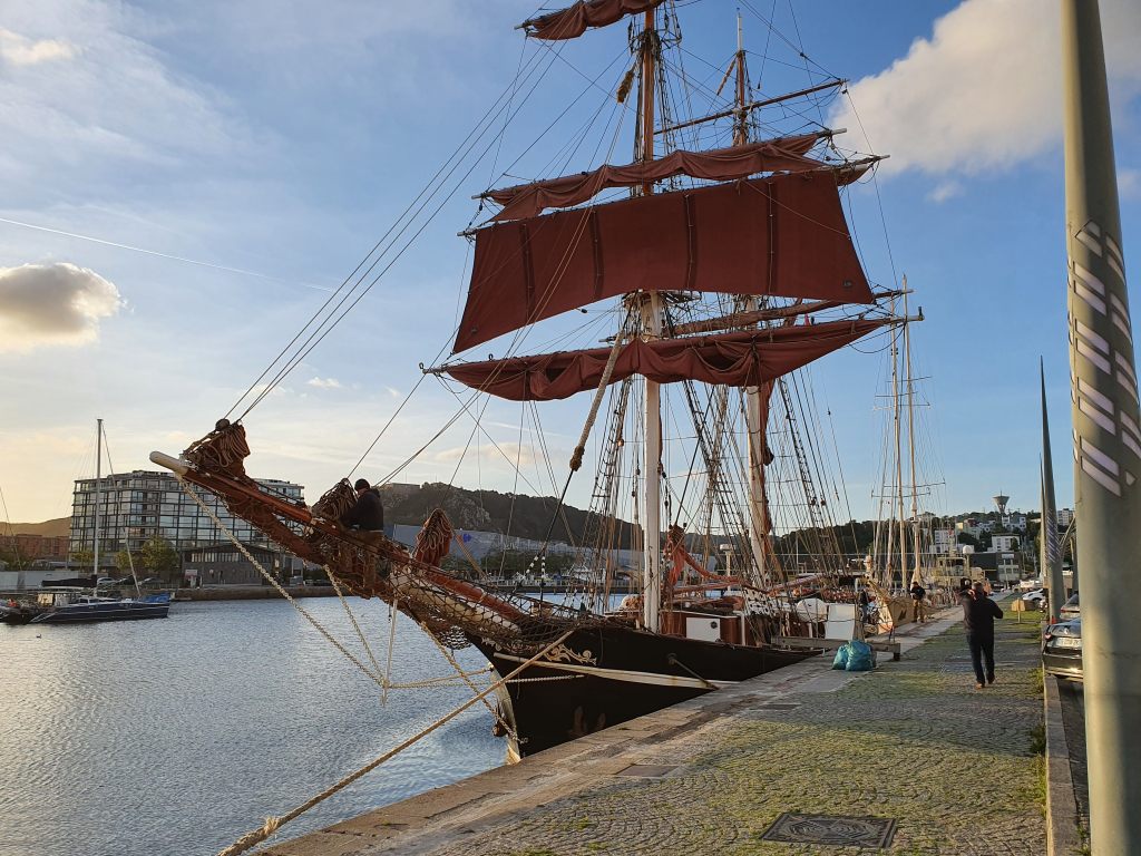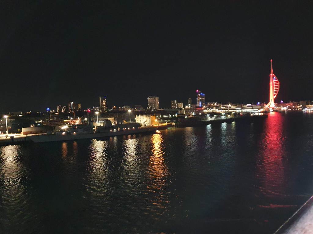 On leaving the dockyard I strolled back to Southsea Common, keeping an eye open for places to eat that evening. As the sun began to set I made my way to a pizza restaurant overlooking the harbour entrance for dinner. I wanted to spot from my table the Galicia (the boat I was planning to catch later) coming into Portsmouth. I was tracking her progress on a marine traffic website – by the time I had finished eating she had rounded the Isle of Wight and was approaching Portsmouth. I briefly visited the restaurant’s toilets before departing, but as I came back I realised the Galicia had already gone past my viewpoint and was about to disappear out of sight as it headed north to the ferry terminal. I ran outside to take a not very good photograph of its stern as it passed – I had completely misjudged the speed at which it would be travelling as it entered the harbour – unlike the Isle of Wight ferries which had slowed right down at the harbour entrance, it was still travelling at speed as it had another couple of miles to go before it docked.