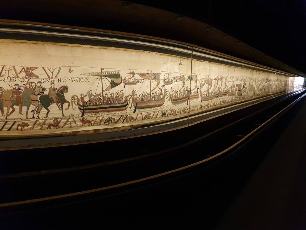 The Tapestry is laid out in a horseshoe shape, around the outside of which you walk. I had seen it once before on a school trip in 1970 – the layout was not as I remembered, but I subsequently discovered that it had been housed in a different building then. Today I had the Tapestry entirely to myself, which felt very special. Only as I was getting towards the end of the first leg of the horseshoe did the couple who I had seen waiting earlier enter the room, only to leave again immediately apparently having a problem with their audio-guide – I did not see them again. The audio-guide plays a continuous narrative, which I assume is designed to keep the crowds moving along when the display is busy. As I had the place to myself, I had the luxury of going back and examining some scenes in more detail – it is surprising how much you can miss on a first look.