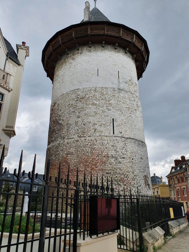 When I had thoroughly explored the old parts of the city centre, I visited the Historial Jeanne D’Arc a multimedia presentation of the trial of Joan of Arc situated in the former Archbishop’s Palace where the trial had taken place. You walk from room to room in the palace while the testimony of witnesses at the trial are projected on to the walls. The dialogue is in French, but at the start you are given a headset for translation into other languages. Because each scene is played out in a separate room, you have to start at a specific time slot. For my 4:15pm starting time, other than myself, there was just one Spanish family waiting. In each new room of the palace we had to wait a few minutes for the next scenes to begin to be played out, as I assume the timings are based on a rather larger number of people having to transfer from room to room.