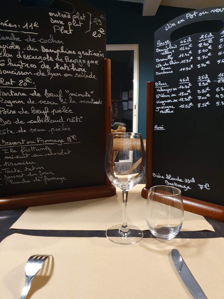 When I had finally finished my explorations for the day I was a little tired when I returned to my hotel. Rather than exploring further afield for dinner that evening, I just booked a table for later in the restaurant adjoining the hotel. The dinner much revived me – I had terrine for starter, followed by bavette with onion sauce and frites, and crepes with bananas for dessert, washed down with a carafe of Côtes du Rhône.