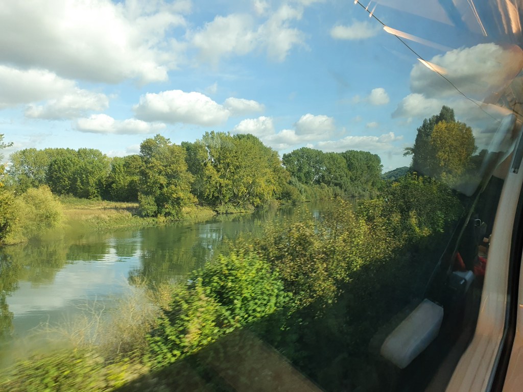 The train to Paris was another double-decker and again I was on the top deck. The reserved seat I was allocated did not have the best views, so once we had departed I knew that I could safely find a better seat with clear views to both sides, as the train was non-stop to Paris. Throughout the journey the railway line follows the Seine valley, usually with tantalising glimpses of the river through the trees that lined the track for much of the route.