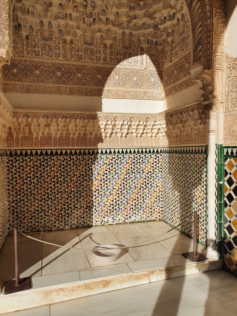 We had high expectations for our visit to the Alhambra and we were pleased that it lived up to them. I had remembered an account by the mathematician Marcus du Sautoy in his book Finding Moonshine of his visit to the Alhambra. As Muslim art does not depict living creatures, the palaces of the Alhambra are famous for their intricate tiled patterns. There are essentially only 17 types of replicating pattern possible on a plane surface and Marcus du Sautoy on his visit had tried to find examples of all 17. Given that, even as a trained mathematician, he found it tricky to identify easily the different patterns and that he only found the last one by jumping over a rope to enter an area which was not open to the public, in the end we decided not to replicate his quest.