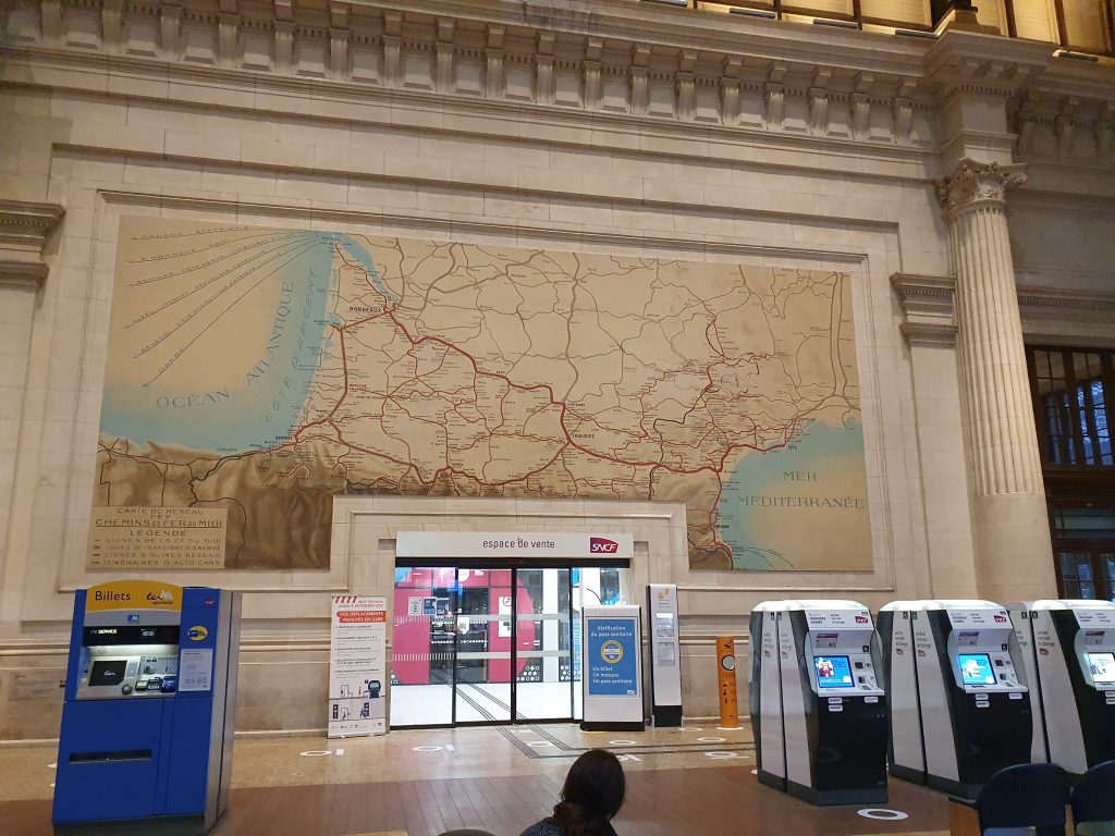 I slept much better than on the previous night, having managed to open the window in my hotel room – I found the rumbling of night trains going past on the nearby railway line rather soothing. Today was my earliest scheduled departure since leaving home. I left the hotel at about 7:30am for the short walk to Bordeaux St Jean station. I had time to admire the splendid entrance hall of the station, with its map of the railway lines of southern France on one wall, before going to find my train, which was waiting when I arrived at the platform.