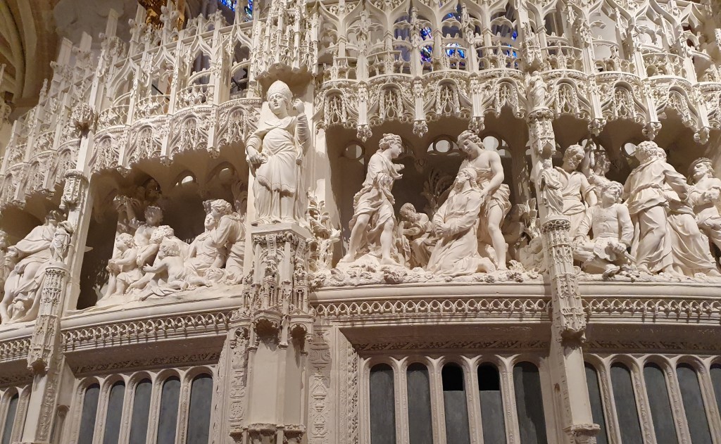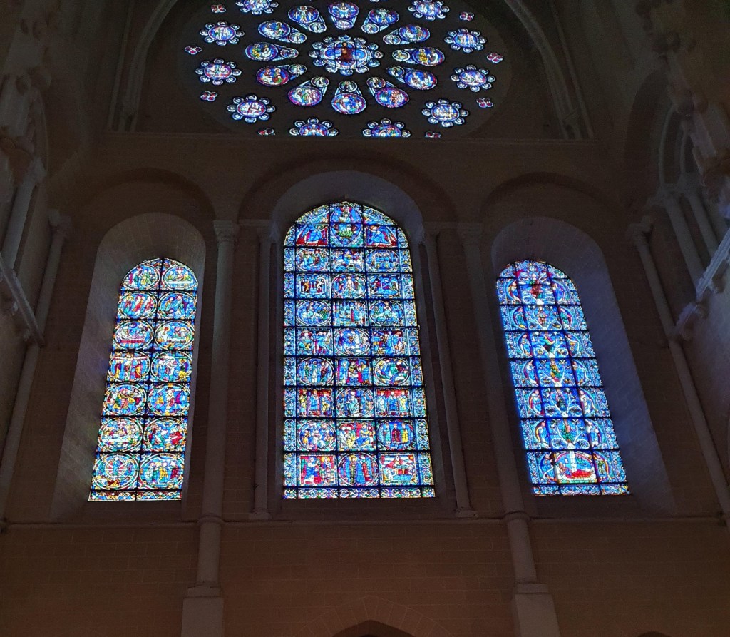 Chartres cathedral is renowned for its stained glass with three large rose windows and for the intricate carving on the choir screen that surrounds the main altar.