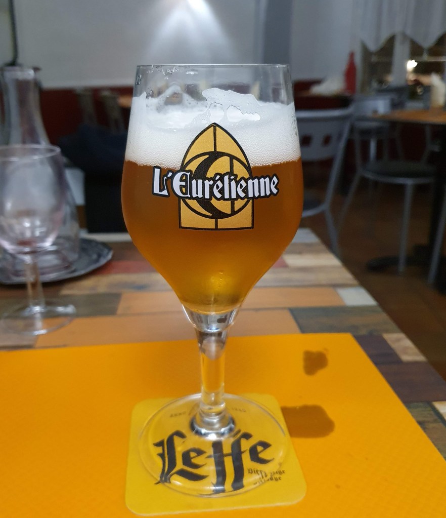 In the evening I ventured out to find my final dinner of the trip. Earlier research on-line had identified one potential establishment, whose website said they did not take reservations. In my wanderings earlier in the afternoon I had found another promising restaurant which had a blackboard outside saying that they would be open on Friday evenings for dinner. I first went to the restaurant I had spotted with the blackboard outside, but when I arrived the blackboard had gone and the place was completely shuttered – it clearly was not going to be open that evening. So I then went to the venue I had found on-line, which its website had said would be open. I was pleased to see when I arrived that the lights were on, the tables were laid and that there were people inside. When I went in and asked for a table, I was told that they were not serving dinner either and was advised that there were open restaurants on the other side of the cathedral. The restaurants near the cathedral were rather too touristy for my taste, so I wandered a little further and found a bar down a side street which had a small restaurant on its first floor. I dined very well there – herring salad to start, pork in mustard sauce for main course, and a berry tart for dessert (though I’m still not sure exactly what sort of berries they were). To drink, I had a carafe of the house red wine. When the waiter asked if I wanted coffee at the end of the meal, I declined but, as it was my final evening, ordered a glass of the local l’Eurélienne beer, which was very good.