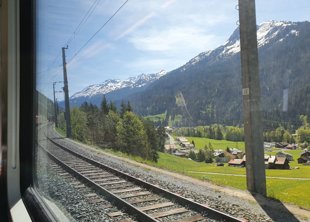 I walked the short distance from my hotel to Zurich’s main station to catch the 0840 train to Innsbruck. I was travelling second class today, because when I booked, the first class option was double the price of second, possibly because the first class carriages included a glass-roofed observation car. Second class was perfectly good – I had a group of four seats to myself throughout most of the journey, which, unlike in some other second class carriages, were exactly aligned with the big windows. Having researched the route, I knew that the train was due to reverse direction at Buchs, and I swapped seats to ensure that I was always facing the direction of travel. My side of the train was also the best for views throughout the journey.