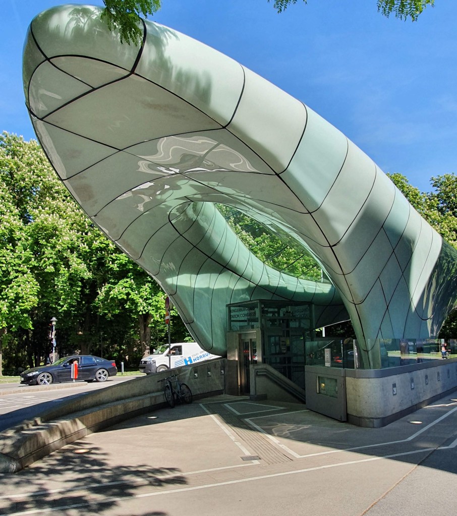 Rather than going to any more museums, I decided to take a trip above Innsbruck. First I checked into my hotel so that I would no longer have to carry my bag around with me. It is possible to travel by a series of cable cars to the top of the Nordkette high above the city. In the end I decided not to go all the way as I was unsure that I would be able to get to the top and back before the service shut for the evening and also because the return fare was more than the cost of most of my other train journeys on this trip. Instead I chose to travel just the first leg on the Hungerburgbahn, a funicular railway which reopened in 2007 with stations designed by Zaha Hadid. The floors in the carriages adjust to keep level despite wide variations in the steepness of the line. Hungerburg is a small village about 300m (1,000 feet) above Innsbruck. The difference in altitude meant that it was pleasantly cooler in Hungerburg than it had been in the city below. Rather than come straight back down again I went for a walk in the woods that climb above the village.
