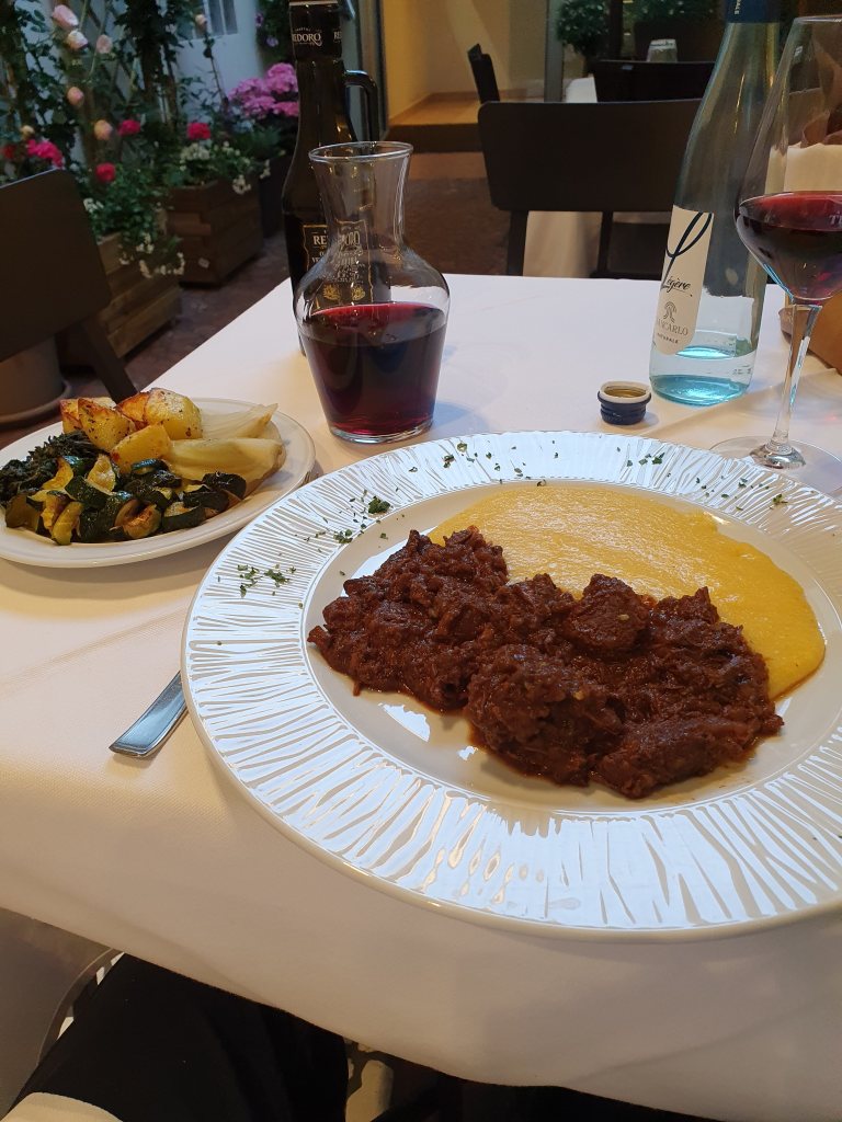 In the evening I had an excellent and very filling meal at a surprisingly empty restaurant, just a little way from the main tourist areas. To start with I had thin tagliatelle with pancetta dunked in bean soup, followed by horsemeat stew served with polenta and grilled vegetables. The half litre carafe of house wine I had to go with the meal cost only €4, cheaper than some beers I had had earlier on the trip, but nonetheless it was very drinkable.