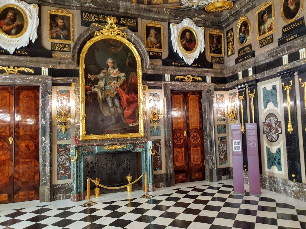 At the appointed time we entered the Royal Castle. This had been completely rebuilt after its wartime destruction and did not reopen until 1984, with final parts not completed until 2019. We had visited previously in 1992, when we remembered parties of very well behaved school children and having to put protective slippers over our shoes. This time we were allowed in without additional footwear and the school parties were less numerous, but nowhere near as regimented as they had been in 1992. The castle had been the main residence of the Kings of Poland and there had been a royal castle on the site since the 14th century. It is ornately decorated throughout and includes a variety of art, including a number of pictures by Jan Matejko, the great Polish historical artist, whose house we had visited in Kraków.