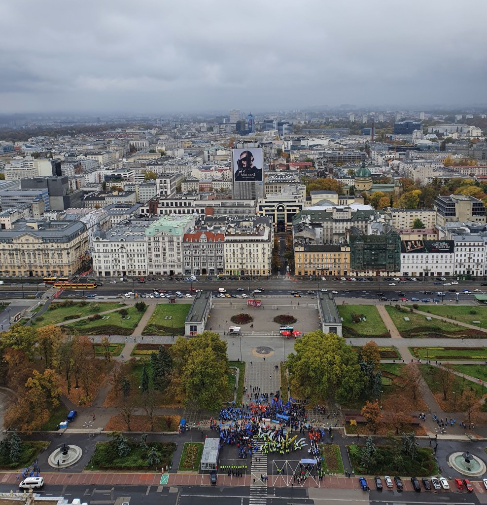 It was still raining, but not as hard as the night before, when we set off for our final full day of exploring Warsaw. We walked through slight drizzle to the Palace of Culture and Science, where it began to rain more steadily as we arrived. There is a joke that the best viewpoint in Warsaw is from the top of the Palace of Culture, as that is the only place in the city where you can’t see the Palace of Culture. As Stalin’s gift to the Polish people the building is not universally liked. It now has a slightly tatty feel to it compared to the gleaming modern office blocks nearby. We took the lift to the 30th floor viewing platform for views of the city in all directions. There was a noisy demonstration, which swelled in number while we were at the top, taking place in the open space close to the building.
