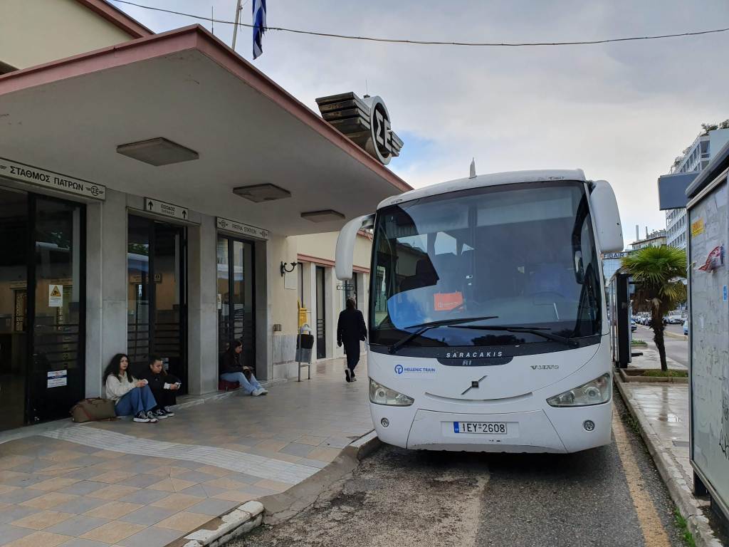 After breakfast in the hotel, I walked to where I now knew Patras railway station to be in the city centre. As the line from Patras is in a rather poor state of repair, there are no trains to Athens, but Hellenic Railways offer a replacement bus service as far as Kiato from where the line to Athens has been electrified. I had pre-booked a ticket on the 1015 bus. When I arrived at the station just before 10am, the bus, as well as a number of prospective passengers, were waiting outside. The bus driver arrived about 10 minutes before we were due to depart and opened up the bus to allow the waiting passengers to board. I bagged a seat in the front alongside the driver, who was wearing an Italian state railway uniform (as Italian railways now also own the Greek rail network).