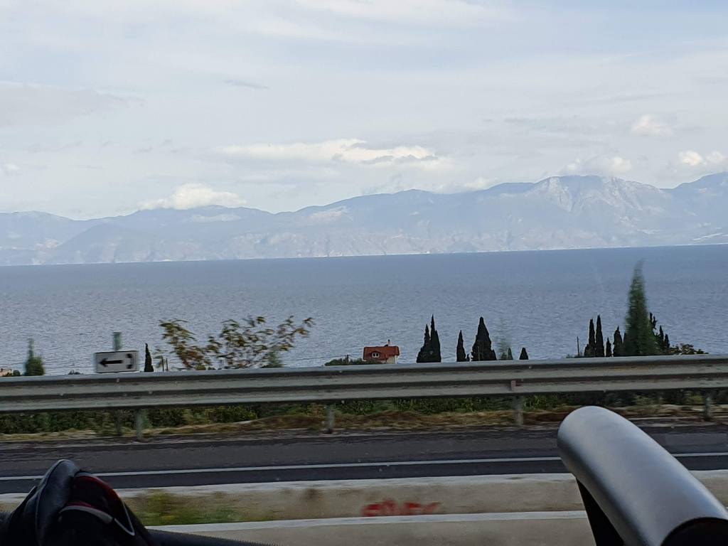 We set off on time and once we had cleared the suburbs of Patras we joined the motorway that runs along the southern side of the Gulf of Corinth. Throughout the whole journey, the driver was engaged in a conversation on his mobile phone, while dancing along in his seat to the music on the radio, and only occasionally putting his hands on the steering wheel. The bus departed from the motorway for a while to make an intermediate stop at another railway station, before returning to arrive in Kiato on time at 1150.