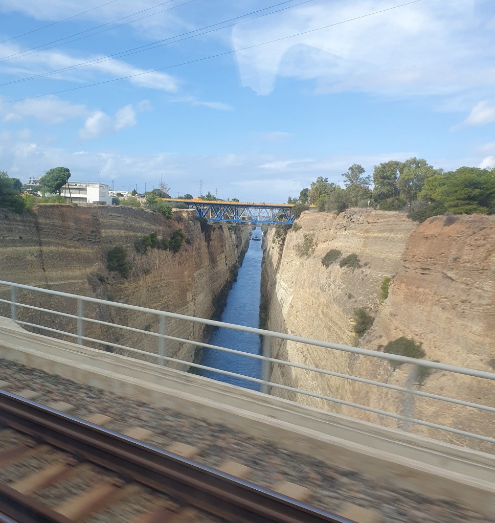At Kiato station, as there was no explicit information about which platform the trains to Athens departed from, I just followed the others to a platform where there was a train waiting. However, as none of the other people showed any signs of wanting to board this train, I just remained on the platform with them. After a few minutes, another train arrived, which everyone got on and it departed on time at 1159. Not long after leaving Kiato we passed over the Corinth Canal, which was even narrower than I was expecting.