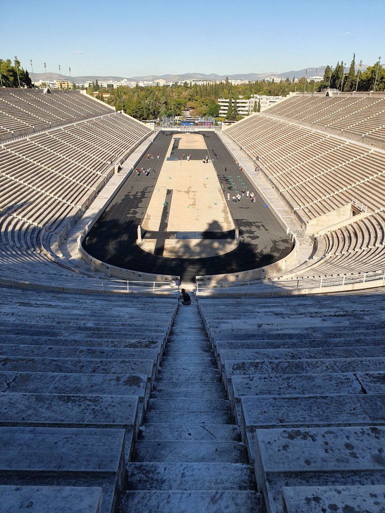 Next stop, a short walk away, was the Panathenaic Stadium, site of the original Olympic Games of the modern era in 1896 and the Intercalated Olympics of 1906. Although now the wrong shape to host international athletics, it was used as the location for the finish of the marathon races in the 2004 Olympics. I was given an audio guide to escort me round the stadium, which included visiting a small museum of Olympic memorabilia. I thought it appropriate that at the time of my visit the centre of the stadium was being used by a group of children for their school sports lesson.
