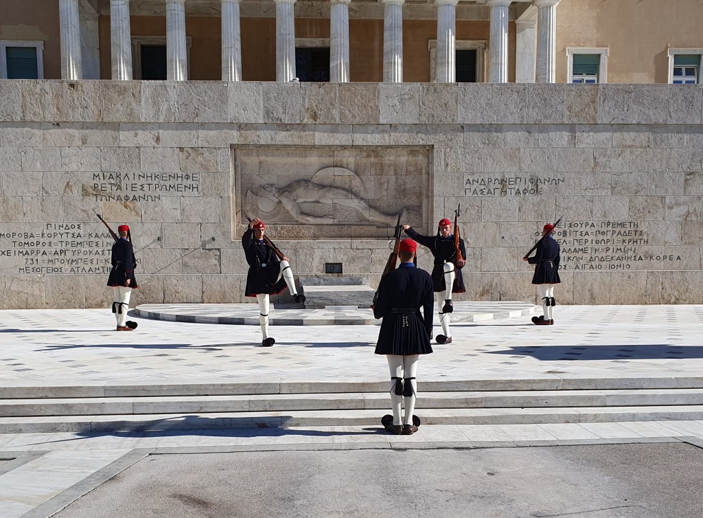 I then walked via Hadrian’s Library to Syntagma Square in the centre of the city. This is where the Greek Parliament is located and the square was the centre of the anti-austerity protests between 2010 and 2012, following the Greek financial crisis. Every hour the guards of the Tomb of the Unknown Soldier are swapped over, and I got myself a prime location to observe the spectacle. Dressed in traditional uniform with oversized shoes adorned with pom-poms, the changing of the guard involves a very elaborate ritualistic silly walk. There are no barriers to separate you from the action, just a few markers on the ground beyond which you should not cross.