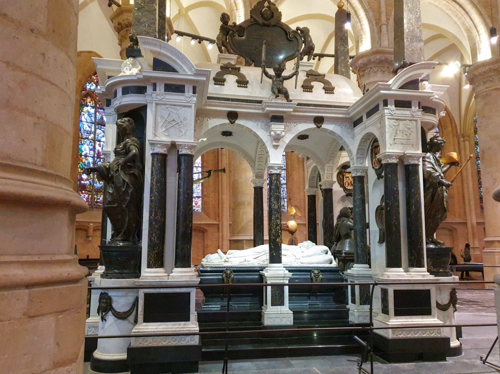 The journey to Delft took just 10 minutes and I arrived there just before 1pm. I walked from the station to the historic centre of the city. My first stop was at the Nieuwe Kerk, completed in the 15th century, and located in the main square opposite the town hall. This is the church where the Dutch royals are buried. The centrepiece of the church is the elaborate memorial to William the Silent, founder of the Dutch House of Orange. As is typical for a protestant Dutch church, there is no altar. The crypt which contains the more recent royal tombs is not open to the public.