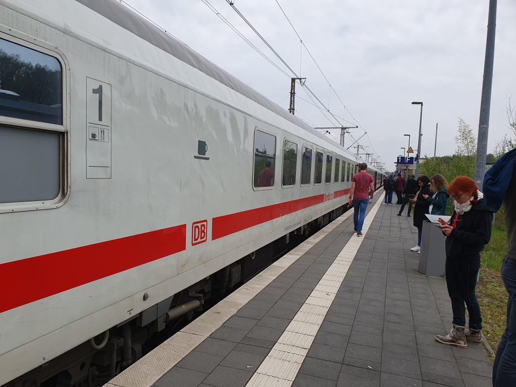 The train arrived on time at the first station in Germany, Bad Bentheim, where it was due to wait for 20 minutes to swap locomotives with its counterpart travelling in the opposite direction. However, it was announced that the other train was running about an hour late and we might have to wait at Bad Bentheim for some time. It was suggested that passengers might wish go on to the platform to stretch their legs and get some fresh air. Eventually the other train did turn up and engines were swapped, with us leaving after a wait of 45 minutes in total, about 25 minutes late.