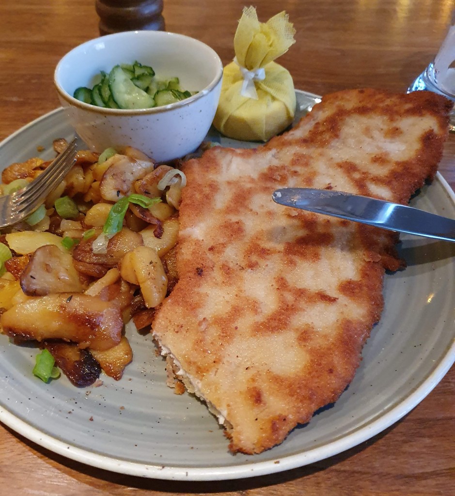 From Berlin Hauptbahnhof I caught a tram to my hotel in the Mitte district of the city. Once I had left my bags, I set out again almost immediately to find dinner. I had identified a schnitzel restaurant about a 15 minute walk away as looking good. Despite being located down an alleyway off a side-street and also a Monday evening, I was lucky to get a table, being offered one in the bar area. It’s popularity was due to the food being very good. I dined on asparagus soup (being the start of asparagus season in Germany) followed by pork schnitzel, washed down with some tasty wheat beer.