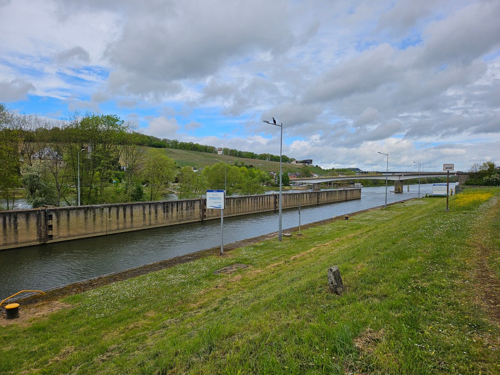I was in France eight minutes after leaving Luxembourg. I wanted to see if I could do the return trip even quicker, given that by the banks of the Moselle the border is much nearer to the bridge across the river. However, I was not sure if my planned route was legal or even actually walkable. I went down a lane past some industrial buildings and crossed a railway line – this brought me to the banks of the Moselle by the locks used to bypass a weir on the river. The locks are in France, but once I had walked past them, I encountered a sign, in German, saying it was forbidden to pass this point. I wasn’t sure if this was just an old relic from the pre-Schengen era or was intended to prevent you accessing the area of another industrial works just on the German side of the boundary. Anyway I decided to risk it. A fenced off area prevented you making a bee-line to the bridge, but it could be bypassed. To get back onto the bridge involved a scramble up a steep muddy bank, but I crossed the mid point of the bridge and re-entered Luxembourg just four minutes after I had left France.