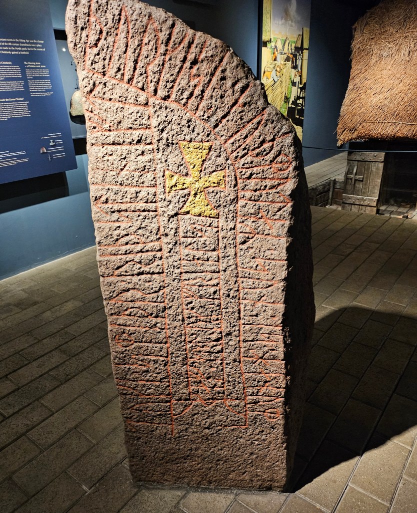 The train took an hour and a half to reach Aarhus, arriving a few minutes late at 15:45. From the station I set off on foot towards the city centre, stopping briefly to drop of my bag at my hotel near Aarhus City Hall. Although built in the 1930s, the City Hall has a modern design which made me think that it looked like a fire station. I continued via the main shopping street to reach the Viking Museum which is located below modern shops on the site of the excavation of a Viking settlement. At the time of my visit, the museum appeared to be unstaffed – you paid on entry at a ticket machine. The museum was not large, but contained various Viking artefacts that had been found on the site and elsewhere, including some rune stones.