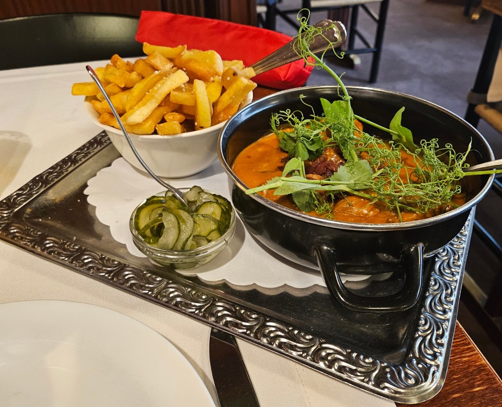 That evening I went for dinner in a restaurant the other side of the City Hall from my hotel. I had asparagus soup to start with (which also contained meatballs), followed by a casserole of beef, sausage and bacon served with cucumber salad and chips. The portions were enormous and I really struggled to finish.