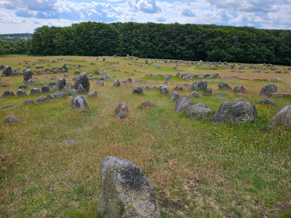 Rather than initially exploring Aalborg, I crossed the road from the station to find the bus stop for the the number 13 bus, which arrived after a short wait. This bus took me off the mainland of Jutland and onto North Jutland island, where I alighted at Lindholm Høje. A walk down a lane brought me to a rickety gate to a field, which I went through and up a short slope to encounter the extensive Viking burial site. My entire view was filled with mounds and stones, enhanced by there being initially no other visitors. On the edge of the site is a dense wood, from where the loud cawing of the crows added to the atmosphere of the place. Downhill in the other direction from which I had come was a small Viking museum. This was split into two parts: the first covered the Lindholm Høje site with examples of artefacts found from excavations, as well as describing the burial and cremation rituals used by the Vikings; the second was dedicated to pre-history in the wider Limfjord area.
