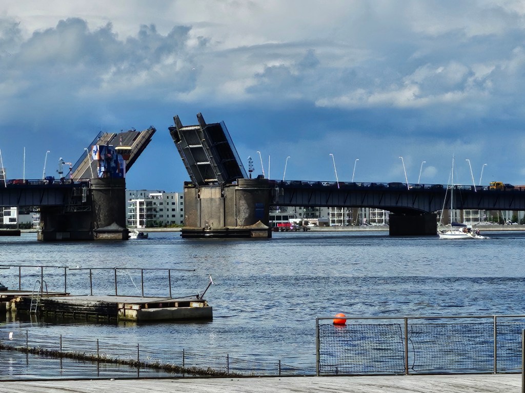 While I was walking along the Limfjord (the stretch of water that separates North Jutland island from the mainland), the road bridge I had crossed by bus earlier in in the day was raised to allow a couple of yachts to sail through.