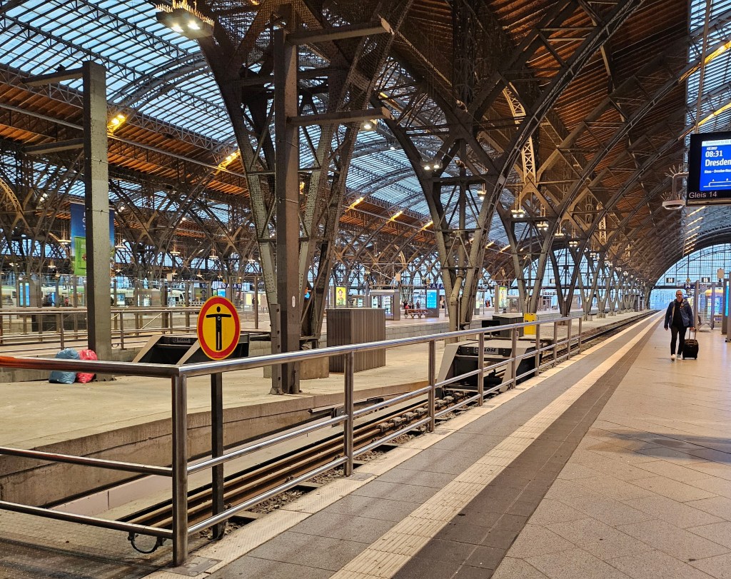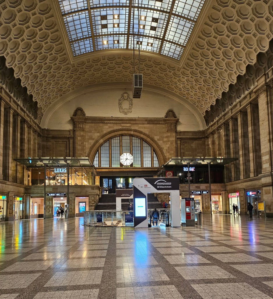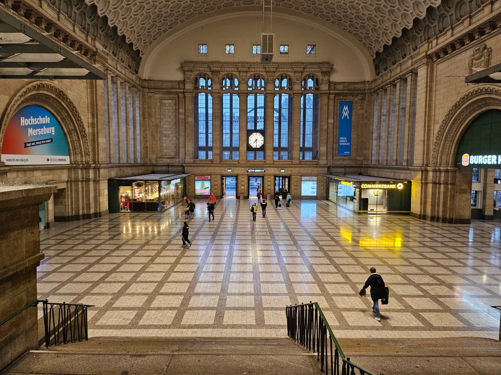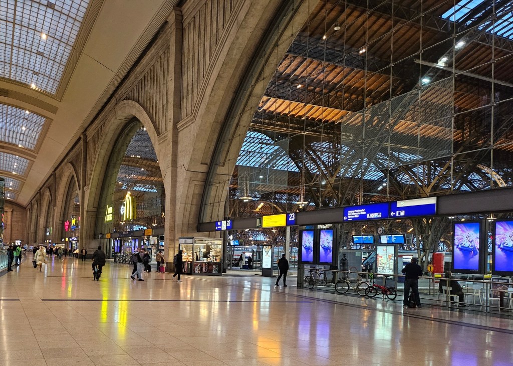 We were making an early start on this day and walked the short distance to Leipzig Hauptbahnhof in good time to catch the 07:48 train to Munich. The station was much quieter than when we had arrived, with no sign of football supporters or riot police. Fortunately, Storm Bruno which had led to the cancellation of nearly all trains in Austria did not seem to be affecting transport in south-eastern Germany, although the weather forecast was for heavy rain all day. Leipzig Hauptbahnhof is Europe’s largest station by area with 19 terminating platforms lined up opposite the long main facade and two more through platforms located underground. We had a little time to explore the station before our train was due. Having come in through the western entrance hall we walked the full length of the concourse to see the nearly identical eastern entrance hall. Our train was coming from Berlin and it arrived a few minutes before it was due to depart, to allow time for it to reverse direction.