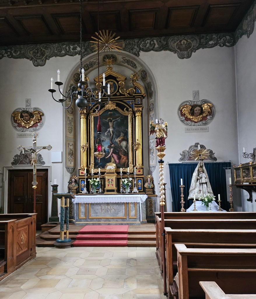 By the time we had finished in the Fuggerei the rain had started to ease slightly, although it was still unseasonably cold. We walked back through the city centre to visit St Anna’s Church. This contains the Fugger chapel, where the remains of the Fugger family have been interred over the ages. Although St Anna’s church became Protestant in 1548, the Fugger chapel (whose upkeep is paid for by the Fuggers) remains Catholic and is highly decorated in a Renaissance style. Within the church you can also see the Goldsmiths’ Chapel, whose walls are adorned with Gothic frescos, the cloisters and a museum on Lutheranism located in the first floor balcony.