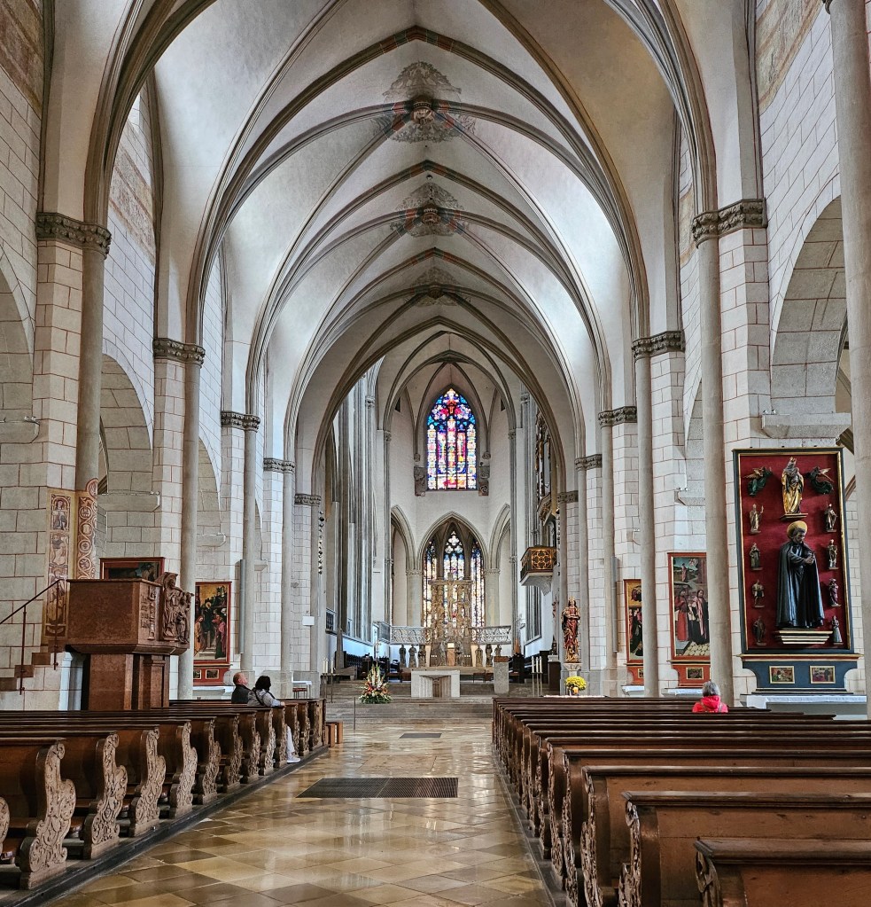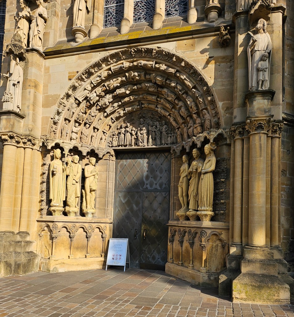 Our final visit that afternoon was to the Liebfrauenkirche (Church of Our Lady) which adjoins the Cathedral. (We couldn’t visit it when we went to the Cathedral earlier, as the Liebfrauenkirche is only open in the afternoon.) It has an impressively carved stone entrance, and the interior of the church is almost circular in shape.