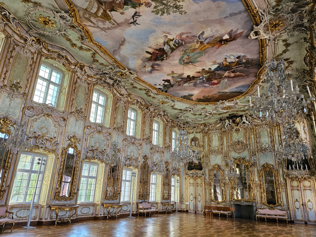 Our final visit that afternoon was to the Schaezlerpalais, which serves as one of the the city’s art galleries. There was a special exhibition of the works of Holbein the Elder, which we found quite interesting, whereas the permanent collection contained nothing particularly special. However the absolute star of the Schaezlerpalais is the Festsaal, which can be accessed through a door from the permanent exhibition. The Festsaal dates from 1770 and has survived intact. It is an amazingly decorated gilded ballroom with a painted ceiling. While the art exhibitions had a number of visitors while we were viewing them, we were the only visitors during our time in the Festsaal.