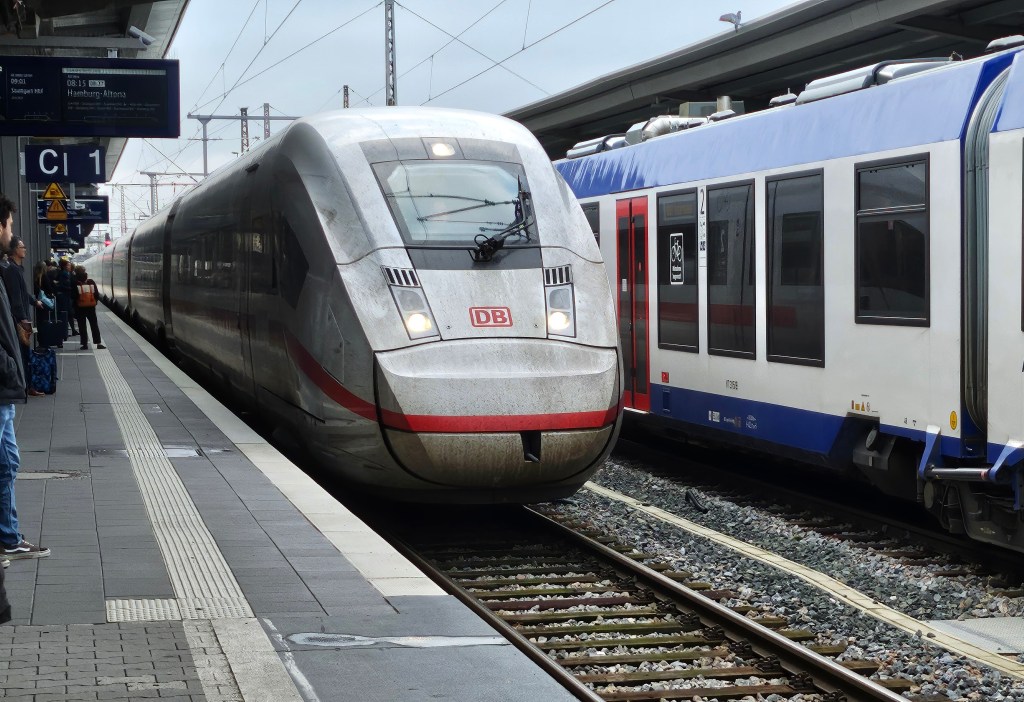 Our train this morning was just coming from Munich, half an hour away – once again it was being announced as an ersatz train with the same timetable to replace the originally scheduled one. However, unlike the train we caught from Wuppertal, our seat reservations would still be valid, so it appeared that the same type of train was being used and I was not sure what made it ersatz. It departed late from Munich and allowing a later train to get ahead of it made it later still, so it eventually left Augsburg 13 minutes late. Nonetheless, it was predicted to make up up this delay by the time it reached Stuttgart where we needed to change. For once, there was some credence to this prediction, as the the train would be able to use the new high speed line between Ulm and Stuttgart, whereas the timetable still seemed to based on the the old slow line timings.