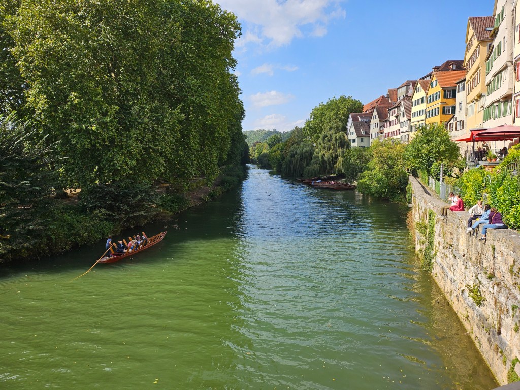 An hour later than expected, we caught the 10:54 for the 40 minute ride to Tübingen. As our hotel was quite near the station, we succeeded in dropping off our bags before setting off to explore. Tübingen is an old university town picturesquely situated on the River Neckar. The Neckar here is much smaller than when it flows through Heidelberg, another old university town, and punting on the river seems a popular pastime.