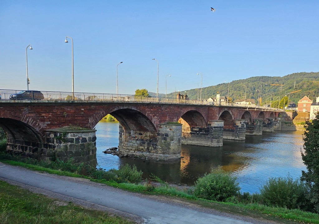From the Cathedral we walked to the Roman Bridge which crosses the Moselle to the west of the city. The pillars of the bridge are Roman, but the upper part of the structure dates from the 18th century. The Roman Bridge is still used by road traffic today.