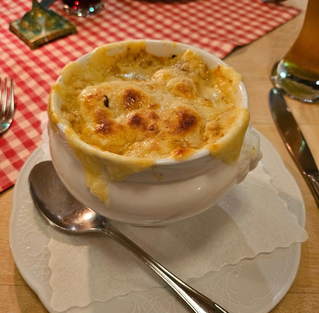 That evening we ate in the restaurant where we had booked a table the night before. I had onion soup to start with, followed by a schnitzel stuffed with ham and cheese.