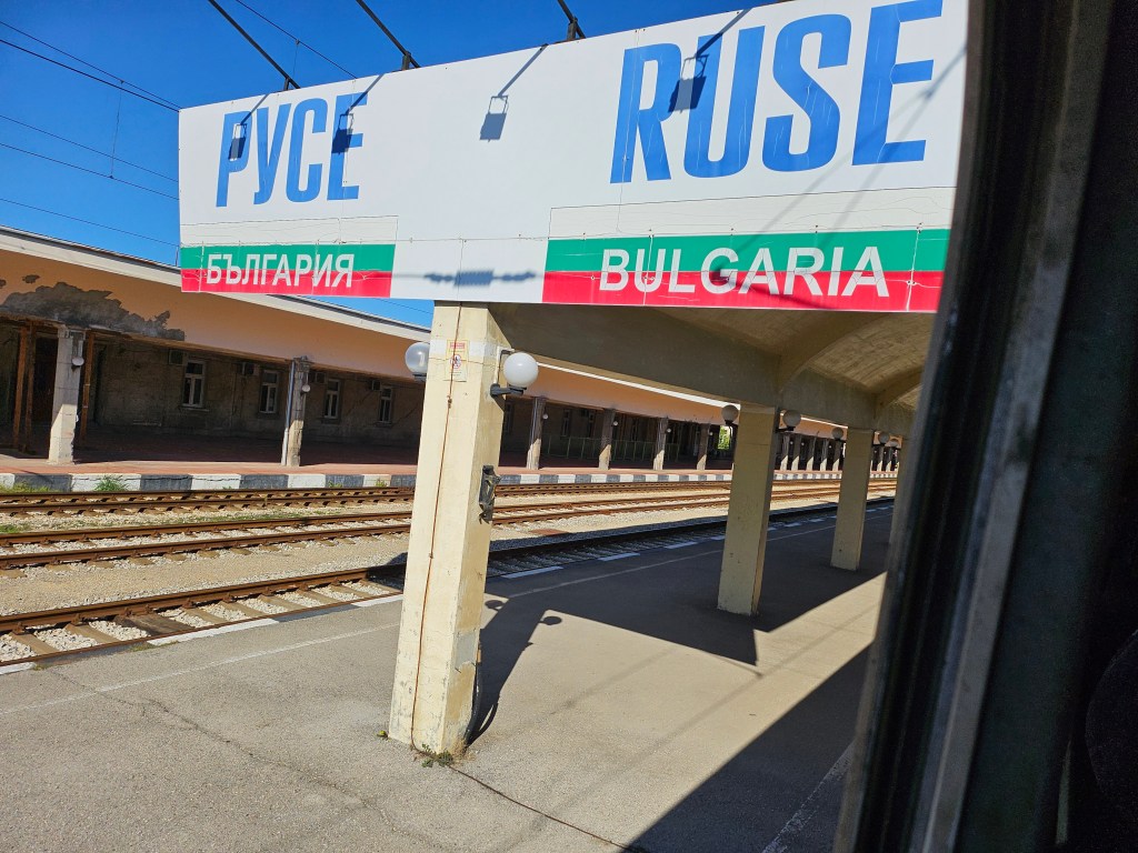 Both Romania and Bulgaria have joined the Schengen Area for air and sea transport, but not for road and rail links. Given that both countries are pressing for full membership of the Schengen Area, it is surprising that they maintain full passport checks between each other. The checks on leaving Romania are done at Giurgiu Nord station, where the train is allocated a 20 minute wait. That said, we had got progressively later throughout the journey and eventually pulled in to Giurgiu Nord at the time we should have departed. A Romanian border official got on the train and went through it checking everyone’s passport and keeping a large number of them (I think the non-Schengen ones) to take away with him to the border post within the station building. Except that he accidentally forgot to check mine – when he got to where my seat was he took away the passport of the person across the aisle from me and then walked on with his back to me. When he came back 20 minutes later he had the passports sorted in order to return them and seemed puzzled that he did not have one for me.