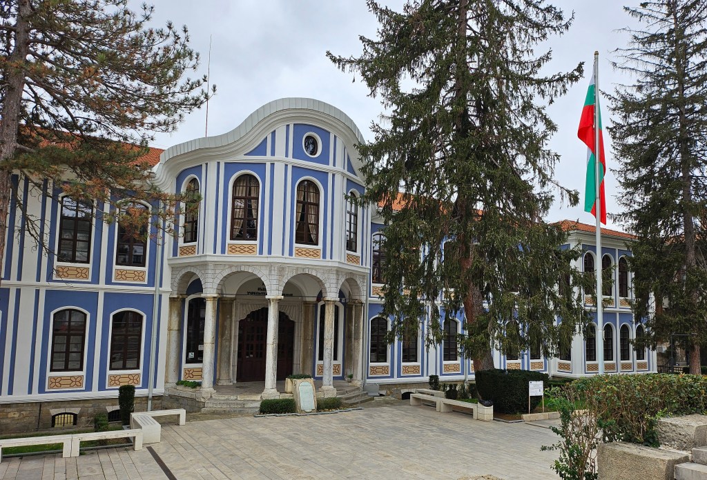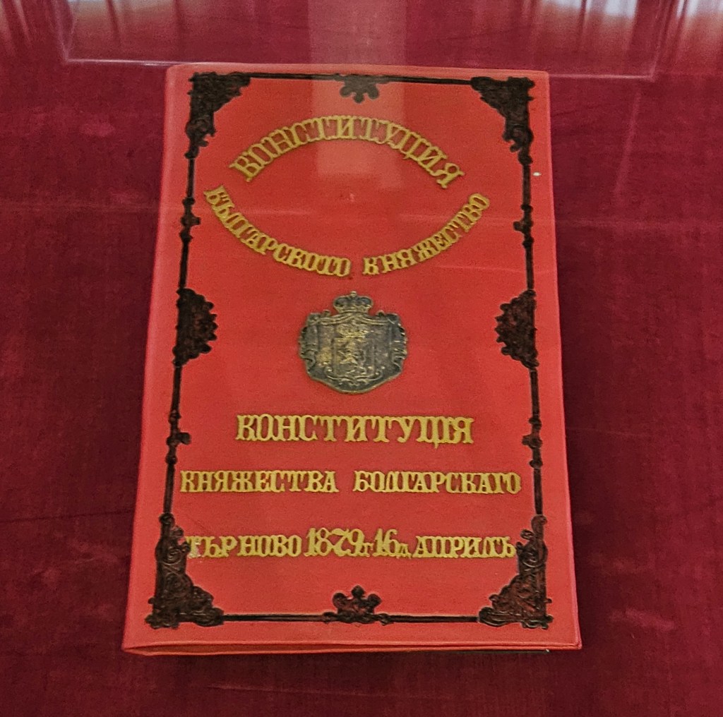 As it was now outside the summer season a number of the museums and other attractions were closed at the time of my visit. I wasn’t sure whether the first building I tried would be open, as in the section on its website listing its opening hours it just said it was closed until the end of 2023. As I approached, looking through the windows the interior appeared to be in complete darkness, so I was not hopeful. However, when I tried the door it was not locked, so I went in. A woman appeared out of the gloom and when I said I wished to visit, she indicated with her fingers the number of lev required and pointed for me to go upstairs. As I ascended, she turned on the lights in the upper rooms. This was an historic building in the history of Bulgaria. Following the overthrow of Ottoman rule in Bulgaria, the Bulgarian National Assembly met for the first time in this building and adopted the Tarnovo constitution, which laid out the principles of government of the modern state of Bulgaria. The Tarnovo constitution remained in place until abolished by the Communists in 1947. The upper floor contained a small museum describing the Tarnovo constitution and other local history, as well as a recreation of the hall in which the first National Assembly met.