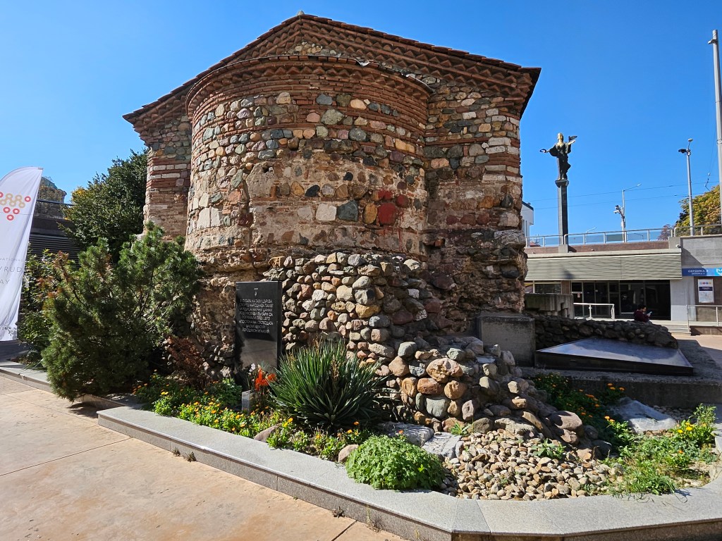 When I had finished in the museum I caught a trolley bus to the National Palace of Culture, where I walked through the adjoining park to pick up the Metro. From there I went to Lavov Most (Lions’ Bridge) station to start a walk to look at some of the sights of Sofia that I had not yet seen. The Lions’ Bridge spans the heavily canalised Vladaya river and, as the name suggests, has monumental Lions placed at each corner. In my walk I visited several other ancient churches – Sveta Nedelya, St. Petka, the Rotunda of St George and the Russian church (originally a private chapel of the Russian Embassy). Unfortunately, these churches did not allow photography inside.
