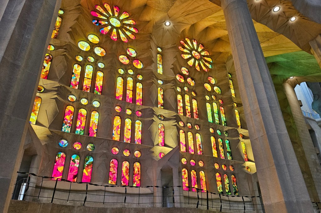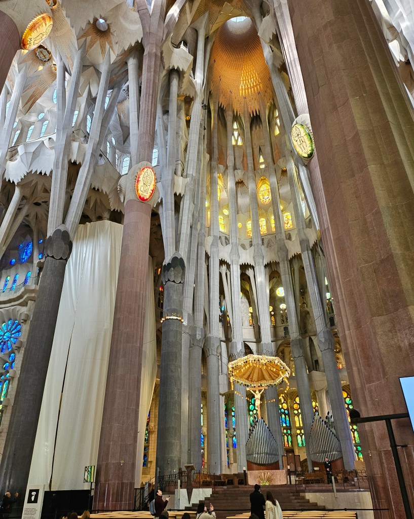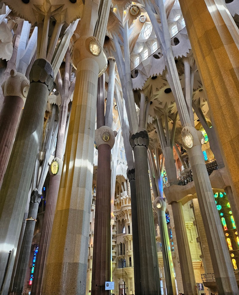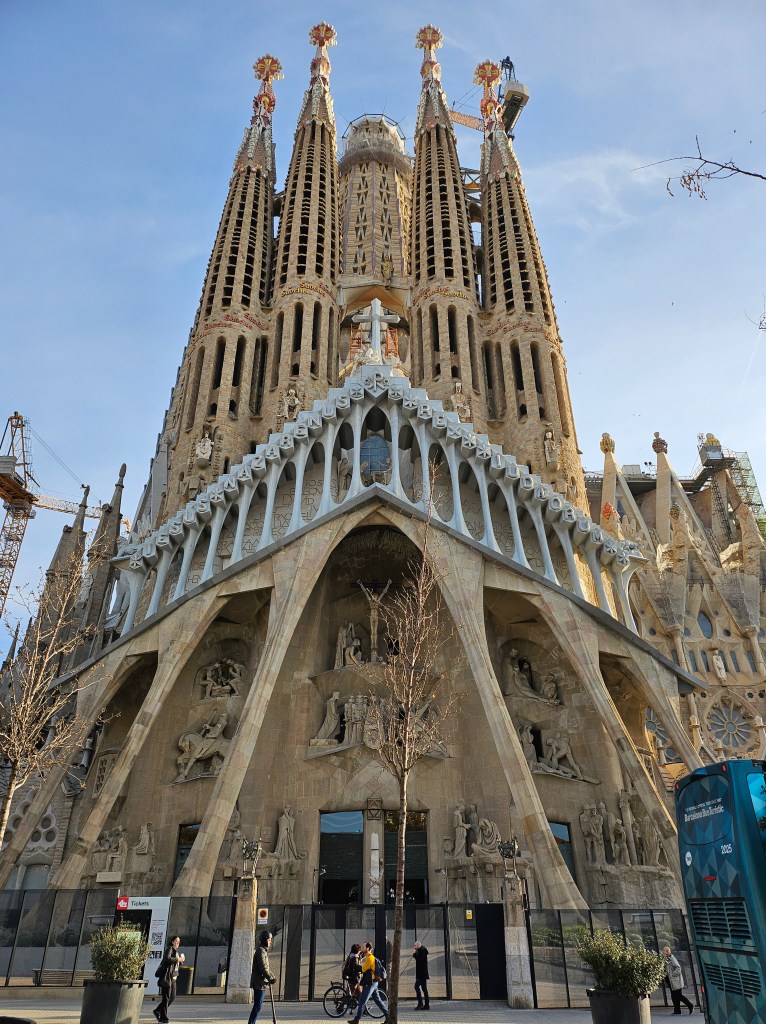 Long before departing on this trip I had booked a ticket to view La Sagrada Familia, the still unfinished basilica designed by Antoni Gaudi. My ticket was for a 9am admission, so I left my hotel in good time to walk to the Sagrada Familia, arriving in time to take a few photos of the exterior before it was time to go in. Construction of the basilica started in the 1880s and may not be fully complete until the 2030s. On my one previous visit to Barcelona in the 1980s, I recall visiting it when it was no more than a building site and not thronged with the huge visitor numbers that come these days.