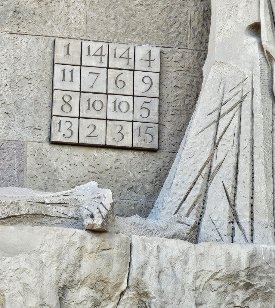 On leaving the Sagrada Familia by the Passion Façade I noticed a 4×4 magic square carved into the wall. Unlike a normal 4×4 magic square, which uses the numbers 1 to 16 to have every row and column sum to 34, in this one they sum to 33, the age of Christ at the time of his death. This is achieved by replacing the numbers 12 and 16 in a normal 4×4 magic square with an extra 10 and 14. However, in this magic square not only does every row and every column sum to 33, but also the diagonals, the four corner 2×2 squares, the central 2×2 square, and the four corner numbers.