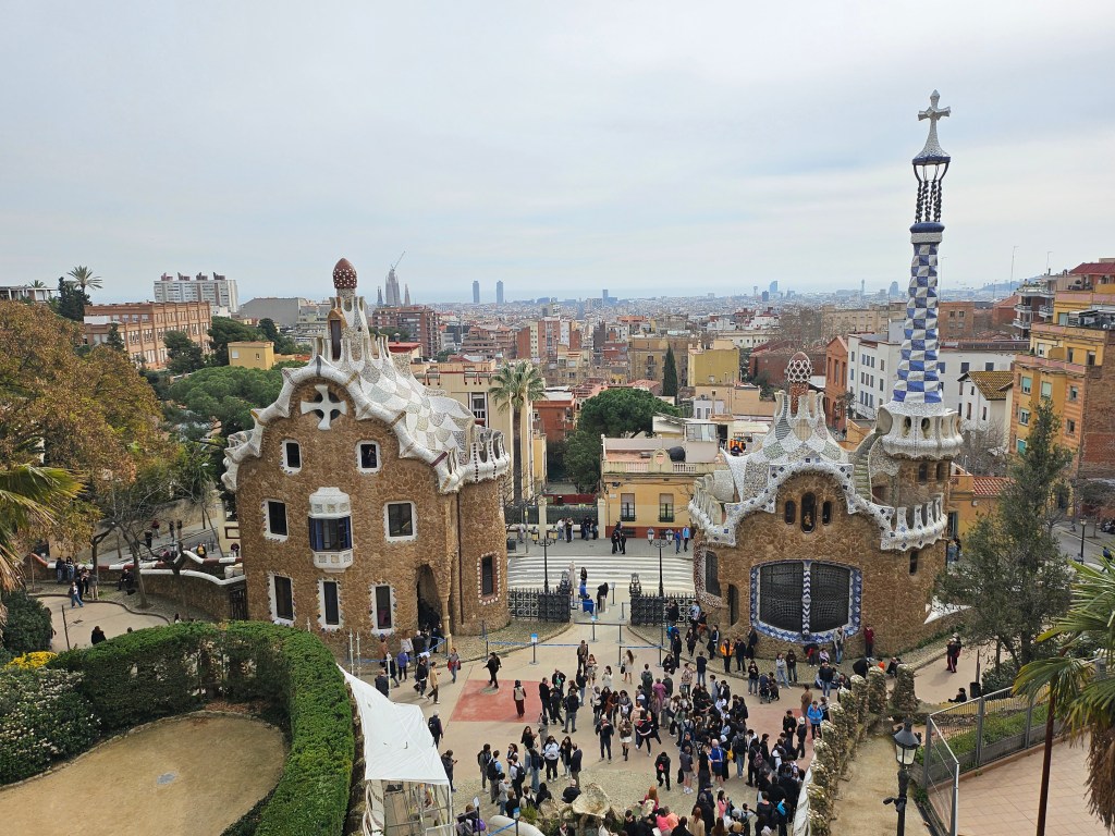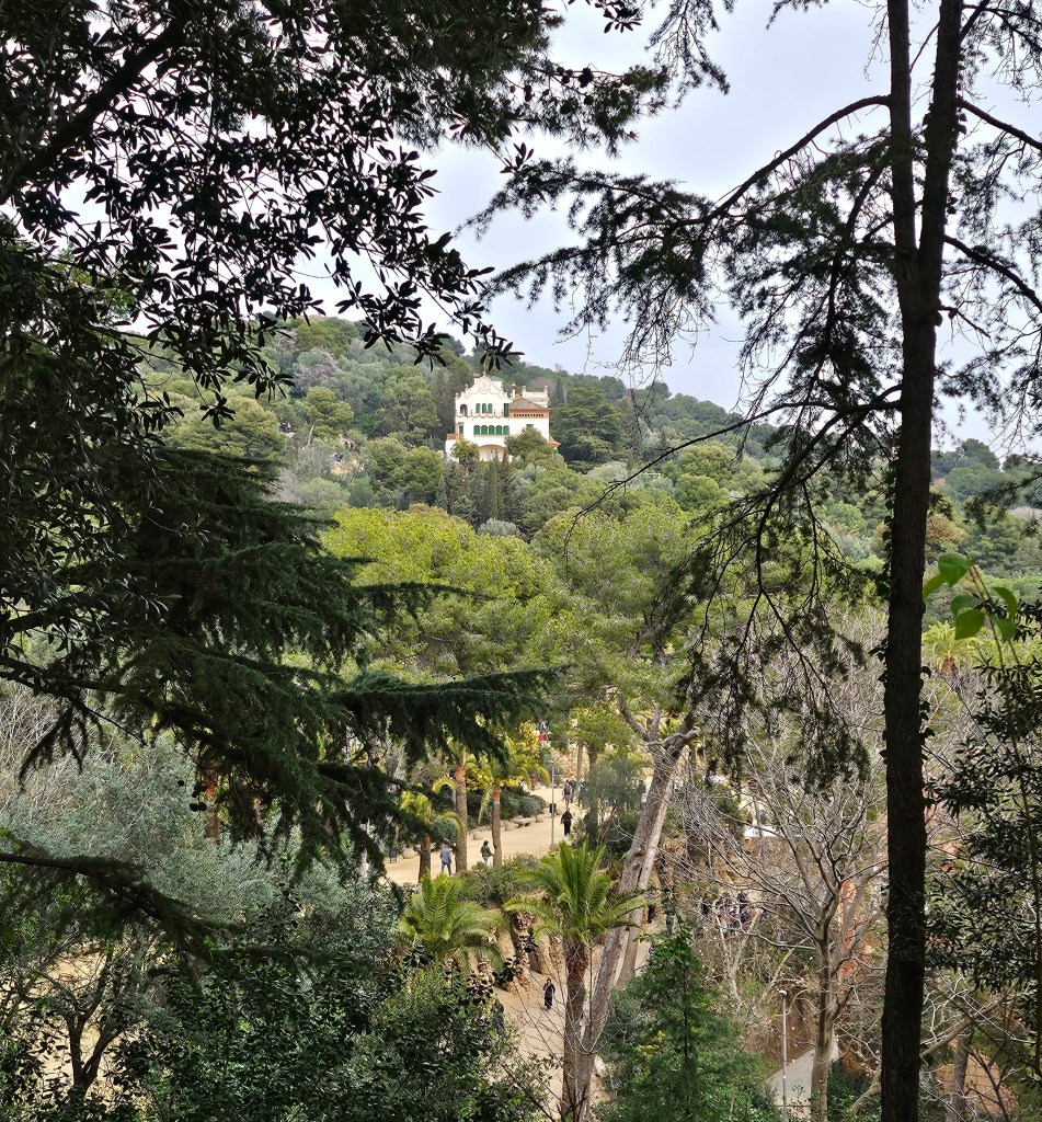 By the time I had finished in the Sagrada Familia it was 10:30 am. In retrospect, I may have made a mistake to have bought in advance a timed ticket for noon for Park Güell on the northern edge of the city, as this meant I didn’t really have time to visit somewhere in between, but would have a bit of time to kill. I used this window to buy and write a postcard home. I then visited a post office to post it and a cafe to have a toasted sandwich as an early lunch.