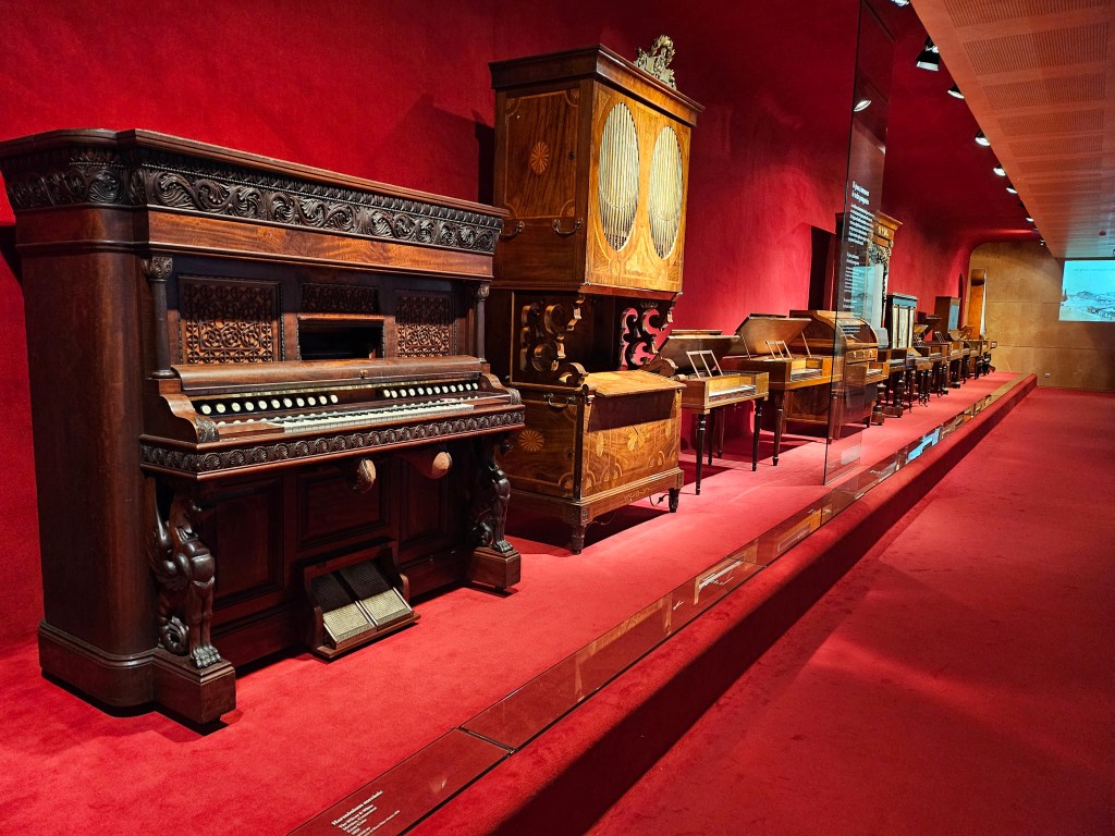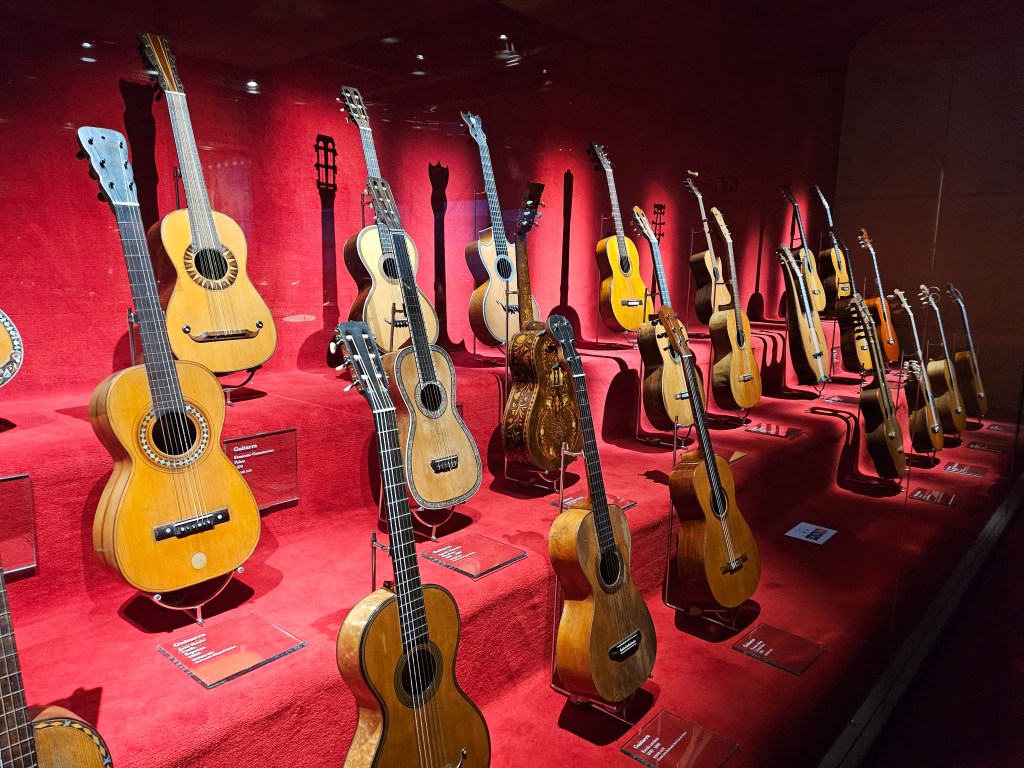 For my final visit of the day, I walked back to the centre of the city to find the Catalonian Museum of Music. This was appropriately located above a music school and as I approached I observed students carrying their instruments arriving and departing. The museum presented examples of musical instruments from throughout history and an informative audio-guide was available to accompany your visit. I appeared to be the only visitor during my time there. One gallery had had its showcases pushed to one side and chairs installed for an event that evening, with a barrier to obstruct access. As there was nobody about, I did not think it wrong to ignore the barrier and have a look at what I would otherwise have missed. Not surprisingly, given their predominance in Spanish and Catalan music, the museum had an extensive collection of guitars. In the final room, there was a collection of instruments which you were invited to play yourself, provided that you treated them with respect. Unfortunately, having no musical talent at all myself, I had to forego that opportunity.