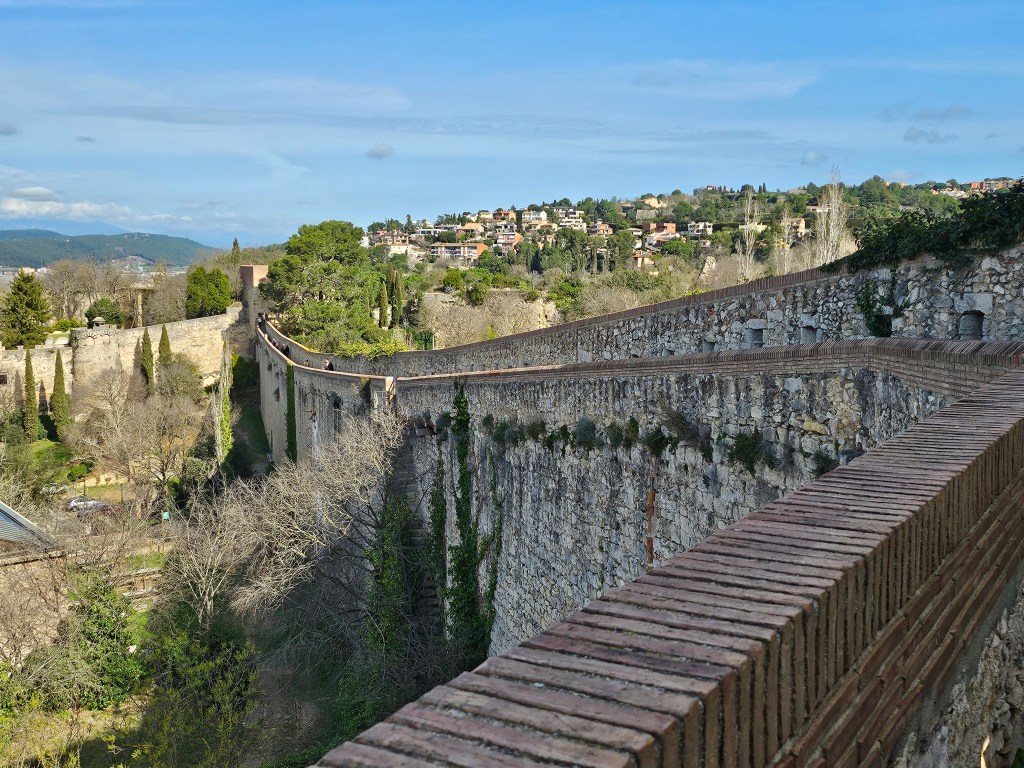 I dropped off my bag at the hotel I had booked just outside the old walled city before going off to explore. To get to the old city of Girona I had to cross the Onyar river, which I did on a pedestrian bridge one along from the red metal bridge built by Gutave Eiffel in 1877. I then climbed up to access the city walls, which I walked along for about half their length giving good views of the city and surrounding countryside.