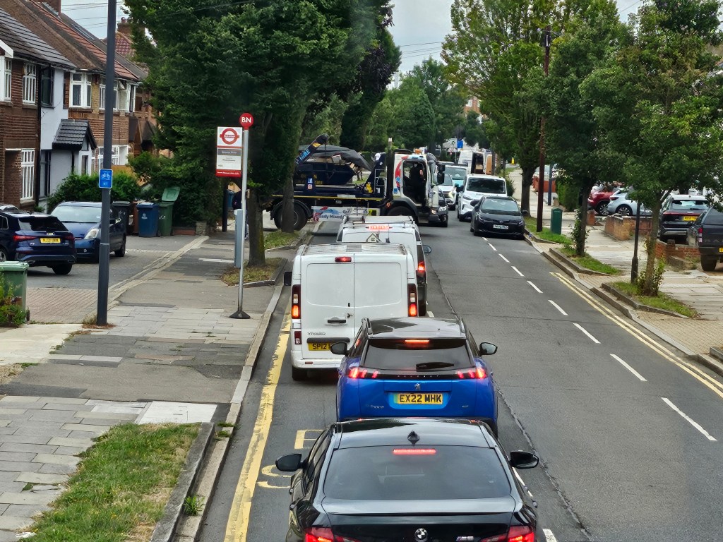 The road leaving Romford was virtually deserted. This was because from the edge of the town centre there are repeated warnings that the road is closed ahead. A major intersection, the Gallows Corner roundabout, is having its ancient flyover replaced over the summer, with access restricted to just buses and emergency vehicles. For other road users lengthy diversions are in place, with the media reporting traffic chaos for miles around. There is only one lane open for the allowed vehicles, with the one way flow controlled by traffic lights. When we arrived at Gallows Corner, we had to wait for four minutes at the lights. When they turned green we paused to allow an ambulance to get ahead of us. Both on the outward and return leg, I noticed some cars passing through the restricted area – unless they had a valid reason, they will be getting fined.