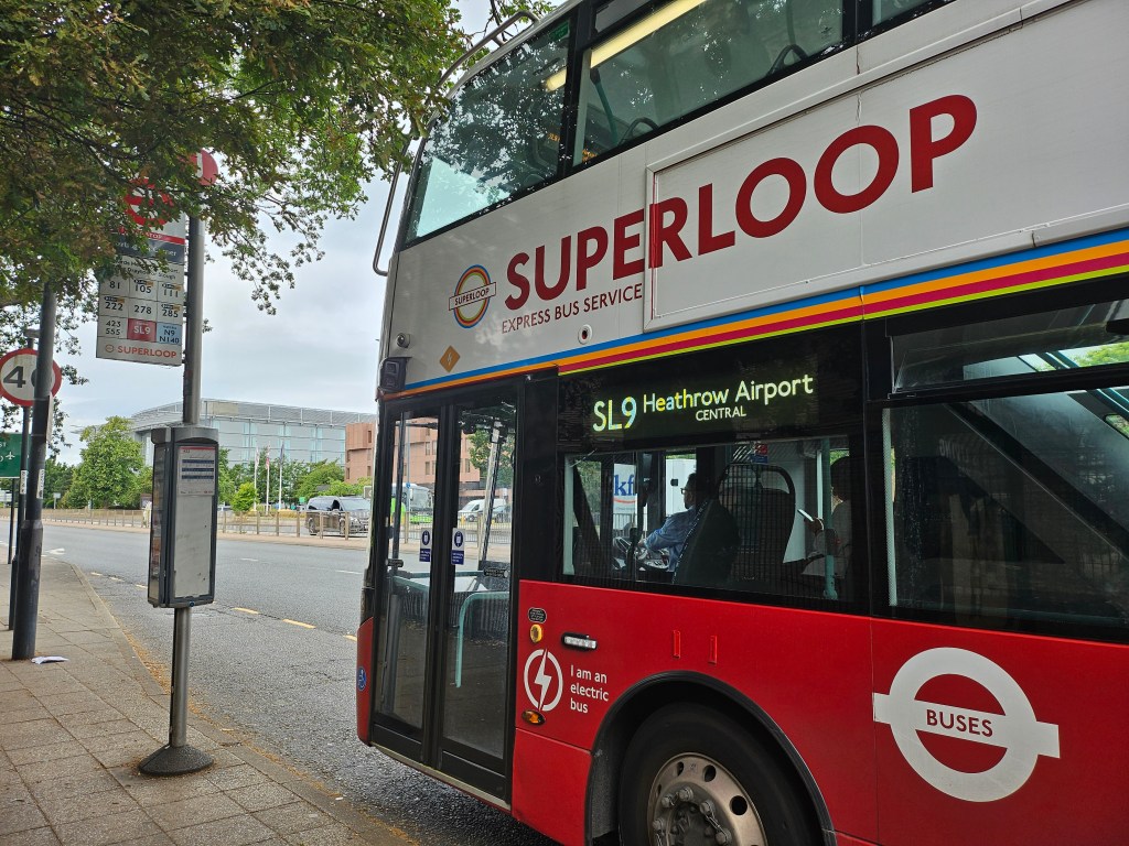 The 285 bus goes all the way to Kingston, where I wanted to be, but I calculated that I should only ride on it a short distance round the perimeter of Heathrow Airport to Hatton Cross station, where I could again pick up a quicker Superloop bus.