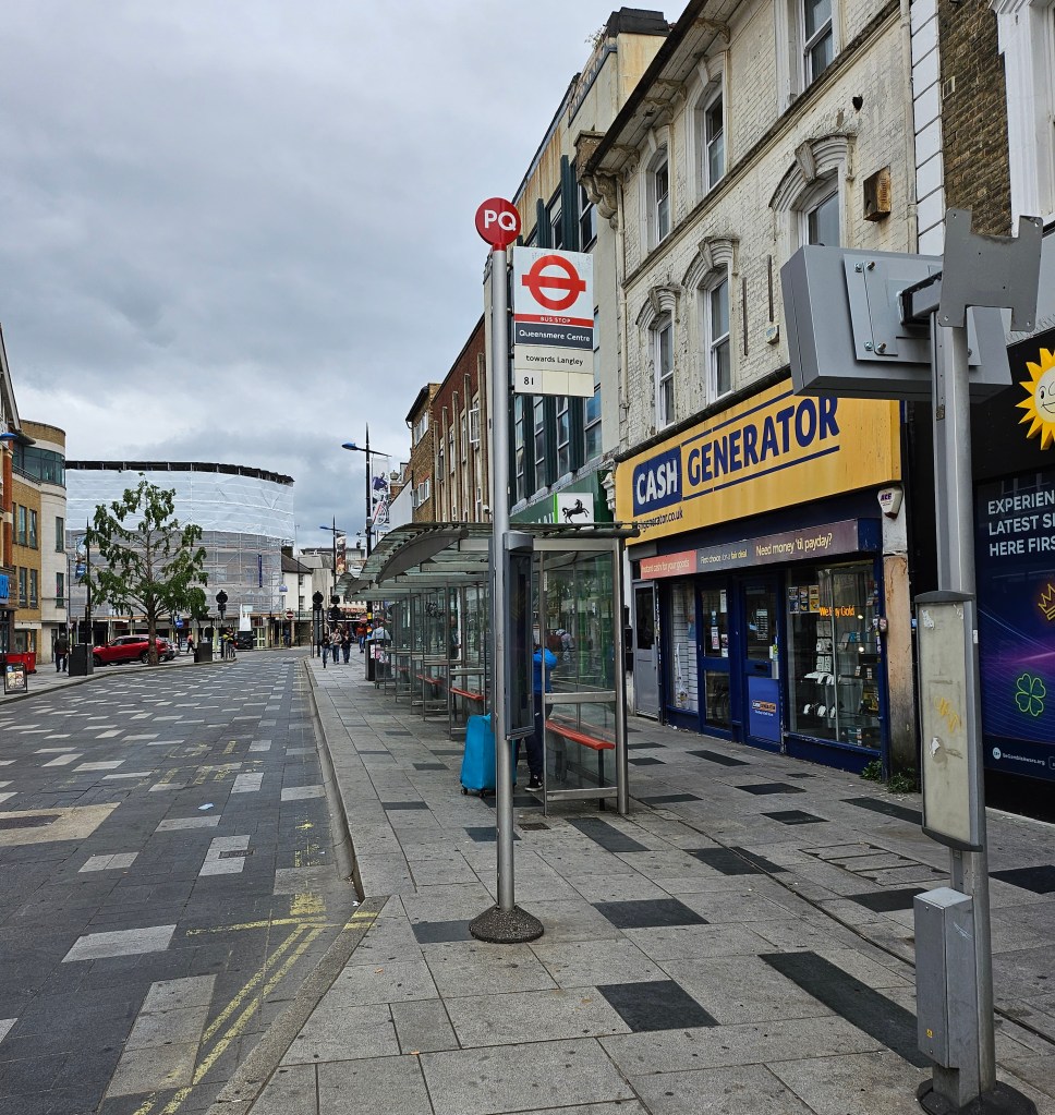 My dash through the alley brought me to Bus Stop PQ, the most westerly bus stop to be served by a London bus, and a couple of hundred metres further west than the terminus stop for the 81. Bus stop PQ has an electronic departure board, which confirmed that the next bus back towards Hounslow should have been departing within in a couple of minutes – except that I could see from the tracker on my phone that it had already left!